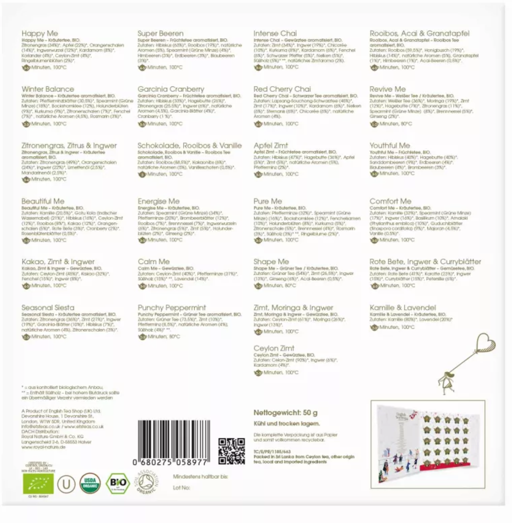 El gran calendario de Adviento en forma de libro de infusiones “Wellness” no sólo tiene 24, sino 25 puertecitas. Cada día, una nueva mezcla garantiza un disfrute variado de las infusiones durante el Adviento. Cada variedad, ya sea té verde, negro, de hierbas o de frutas, es maravillosamente aromática y de la mejor calidad biológica.