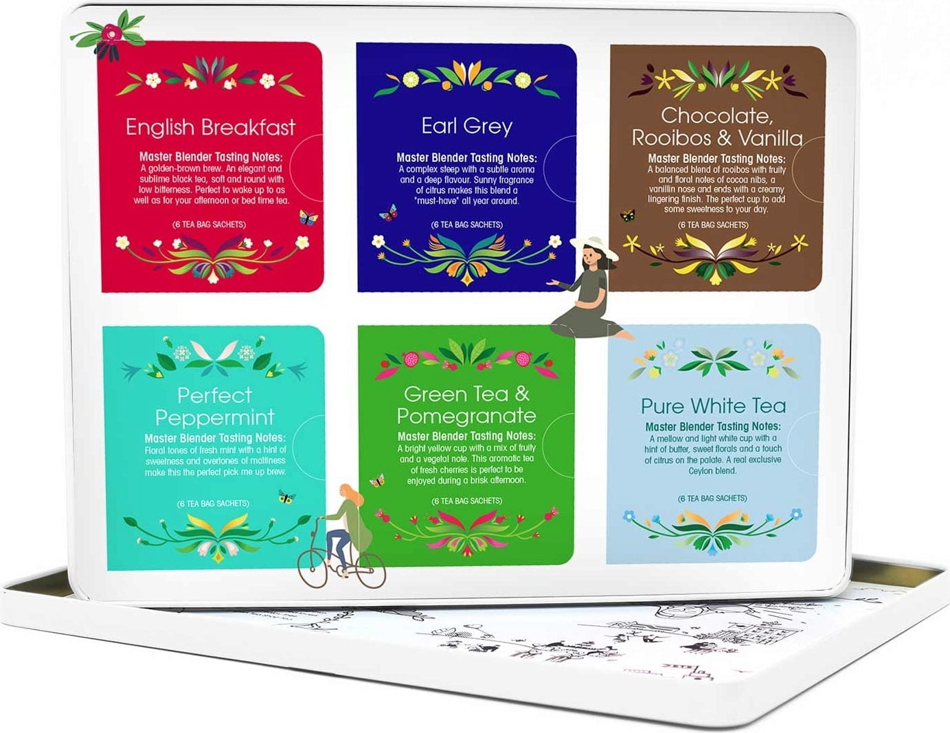 De cada variedad hay 6 bolsitas, conteniendo un total de 36 bolsitas. Así se puede probar y disfrutar libremente cualquier variedad de té o infusión de hierbas al gusto. La caja está hecha de metal repujado y, una vez se terminan las bolsitas, se puede reutilizar nuevamente con otros tés o infusiones de hierbas, o para otros productos, en la cocina o para lo que se desee.