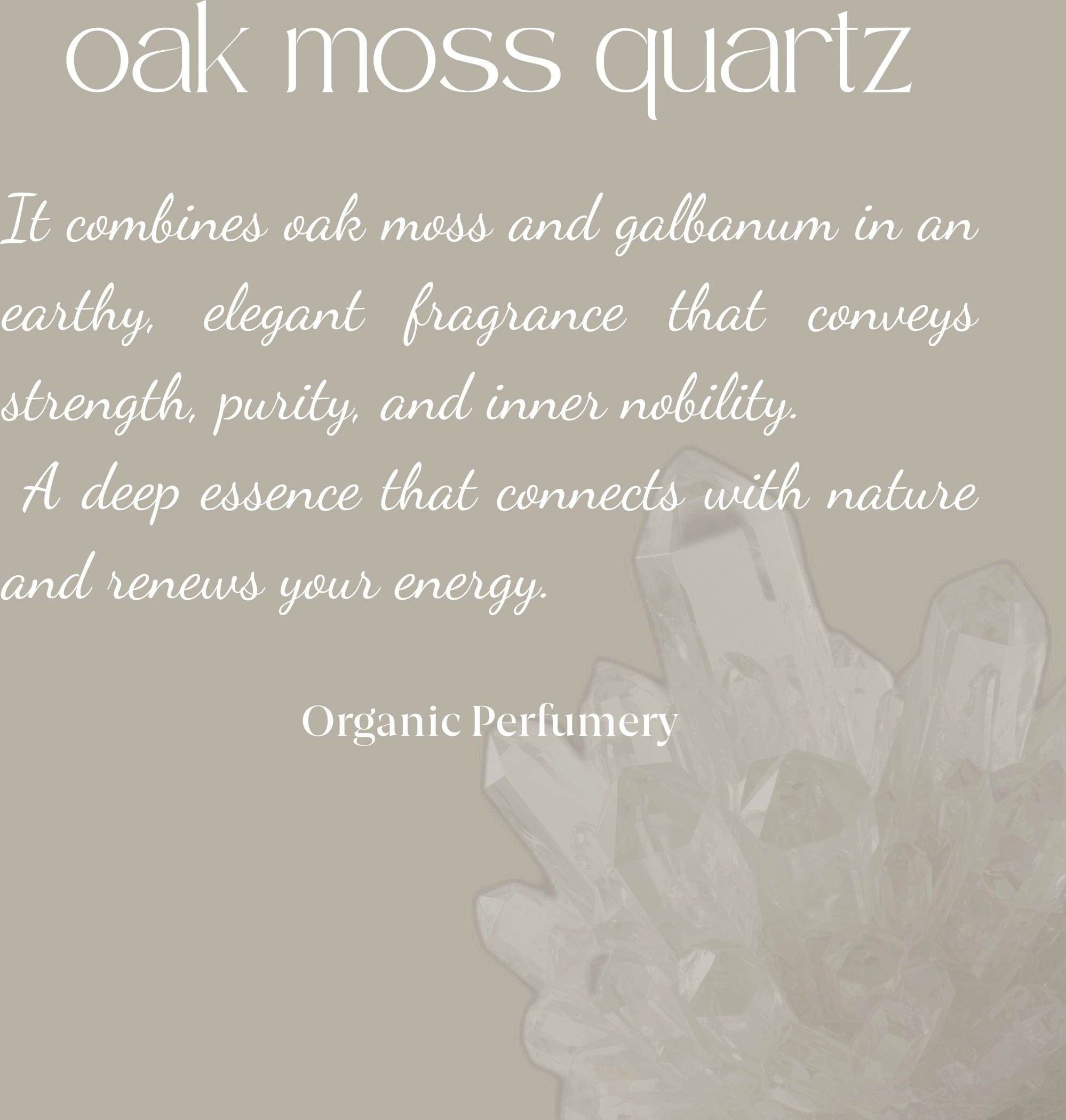 La Perfume Energético Cristalino Ecológico Musgo de Roble es una fragancia de presencia noble y esencia pura. Inspirada en el cuarzo ahumado, esta combinación de flores y musgo transmite fuerza interior, sobriedad y pureza.