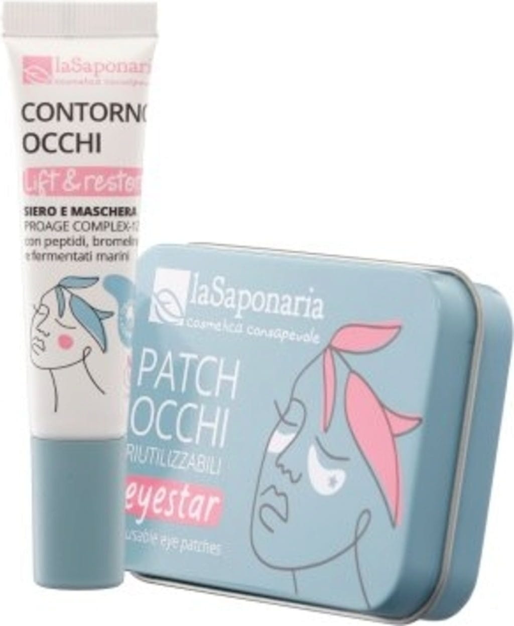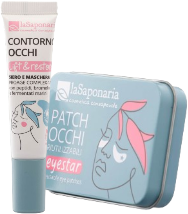 Kit completo para una mascarilla antienvejecimiento para el contorno de los ojos, Zero-Waste y sin plástico. El sérum para el contorno de ojos Lift&Restore, en combinación con los parches reutilizables EyeStar, ayuda a proporcionar una mirada fresca, hidratada y reafirmada.