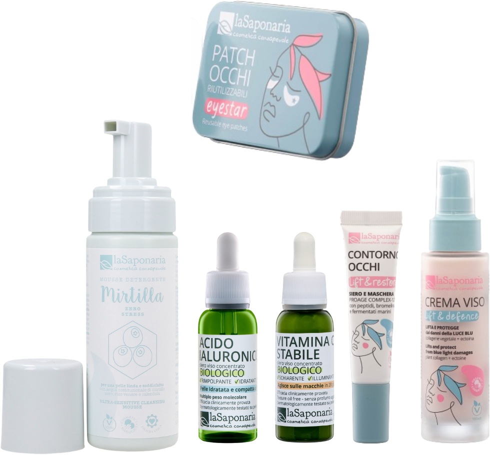 Kit con los productos más vendidos de La Saponaria, ideal para una rutina de belleza completa dedicada a la luminosidad de la piel. La limpieza delicada, los sérums específicos y la crema facial actúan en sinergia para hidratar, iluminar y nutrir la piel. Completa la rutina el contorno de ojos, que también se puede utilizar como mascarilla con parches reutilizables para una mirada más fresca.