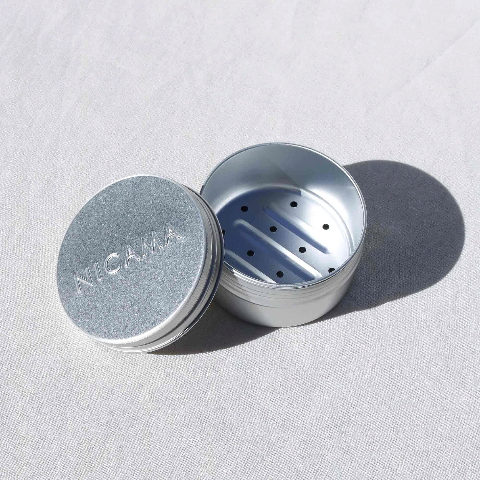 La práctica lata de aluminio permite llevar fácilmente los champús NICAMA de viaje. Su tapón de rosca cierra de forma segura y es fácil de abrir. La rejilla de vaciado opcional es fácil de quitar y garantiza que el champú sólido se seque correctamente.