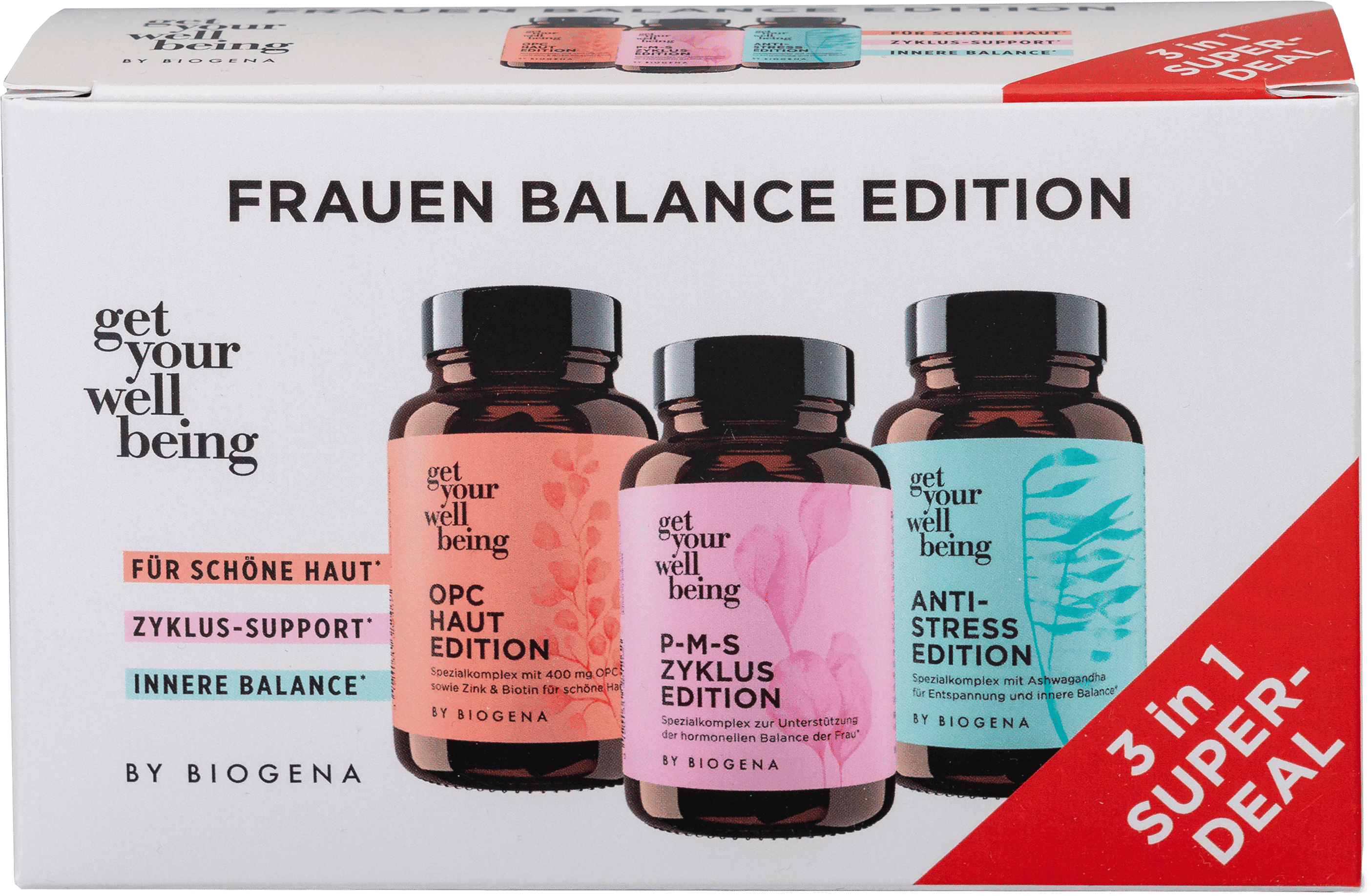 FRAUEN BALANCE EDITION de get your wellbeing by BIOGENA combina tres productos premium cuidadosamente coordinados en un práctico set: OPC HAUT EDITION con OPC de semillas de uva, biotina y zinc, ANTISTRESS EDITION con ashwagandha, magnesio y vitaminas del grupo B y P-M-S ZYKLUS EDITION con raíz de ñame, ginkgo y otros micronutrientes seleccionados, especialmente estudiados para las necesidades específicas del cuerpo femenino.